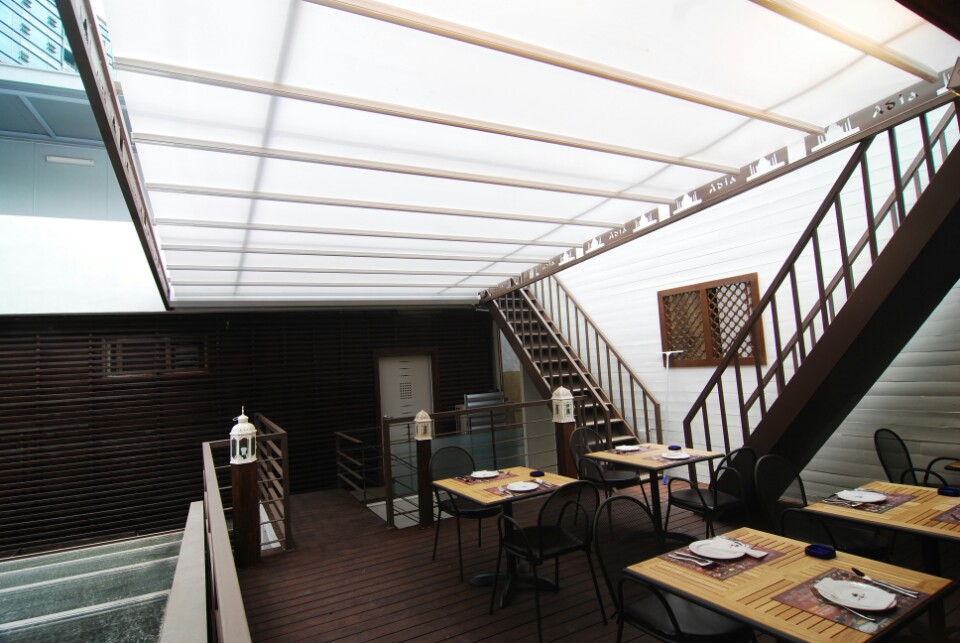 파고라(스카이어닝)은 일반적인 접이식 어닝이 아닌 다면적을 접이식으로 설계하여 새로운 공간을 창출하는 접이식 파고라(Retractable Pergola)입니다.